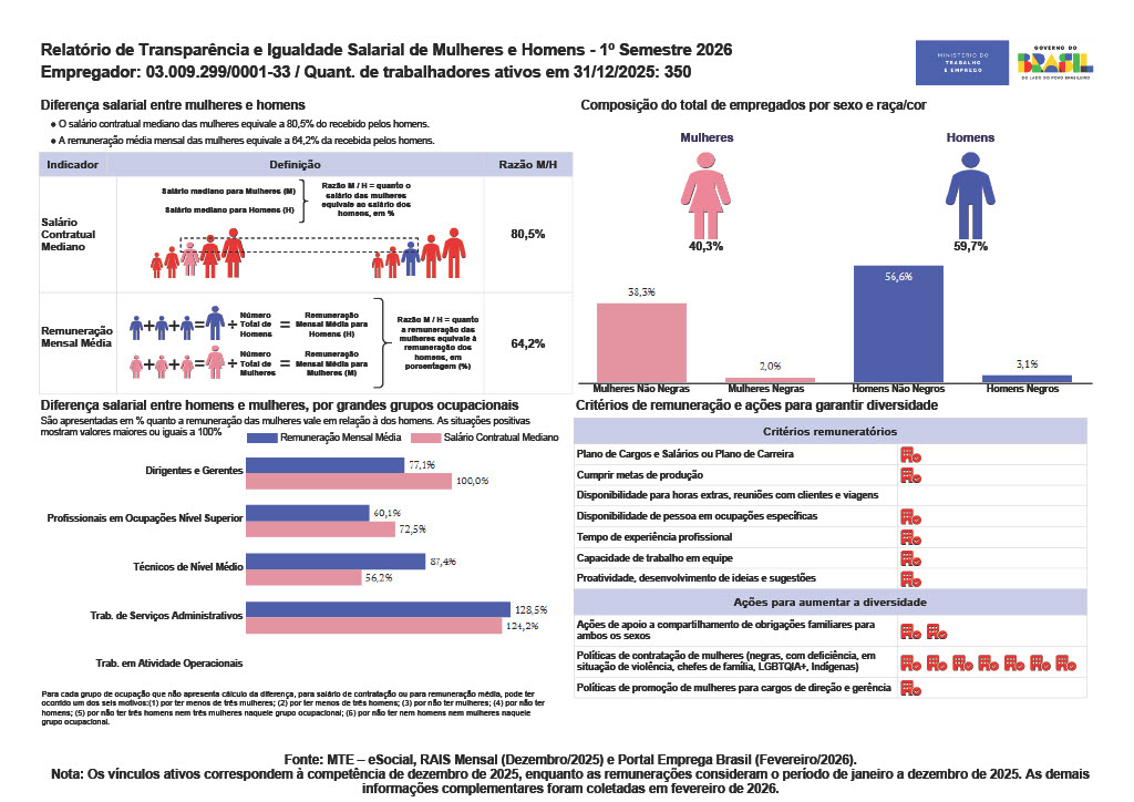 O documento, publicado no portal Emprega Brasil e em nossos canais institucionais, traz informações sobre a composição do nosso quadro de colaboradores e sobre a média de remuneração entre homens e mulheres, conforme determina a legislação vigente.